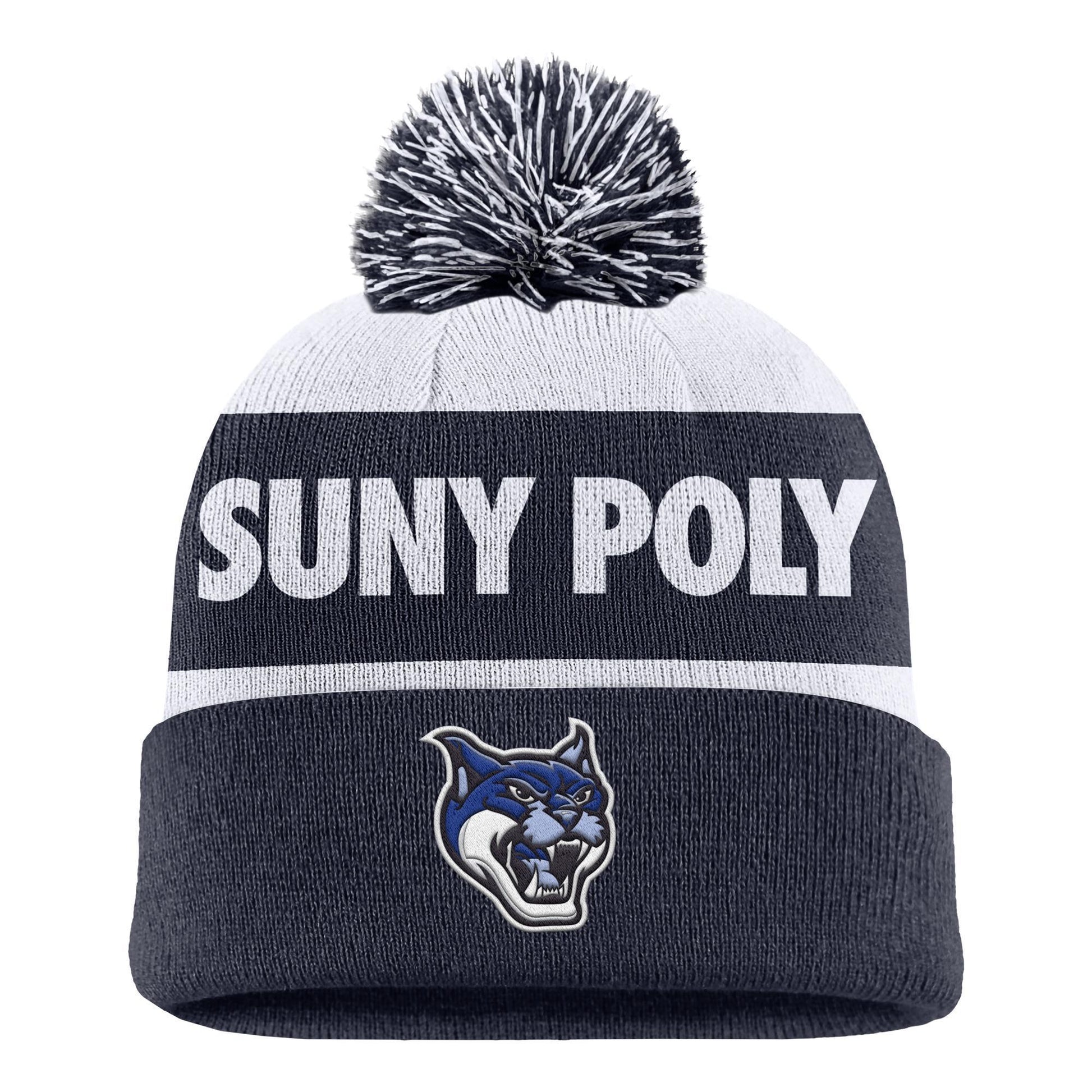 12” cashmere feel acrylic knit beanie with rolled cuff, jacquard text and stripes with pom on top. HD embroidery on center front cuff and Swoosh on tab woven label on wearer’s right back cuff.